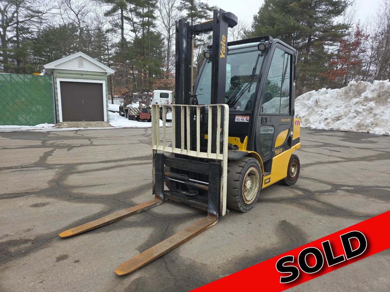 Model GP060VX, Enclosed Cab, Kubota Diesel Engine, Shuttle Shift, Two-Stage Mast with Side Shift and Hydraulic Fork Positioner, 48" forks, Hydra Smooth Shock Absorber, 5,450 Lbs Max Lift Capacity, 2,300 Hours, Magnum Solid Pneumatic Tires, Transport weight of Forklift is approximately 10620 lbs.